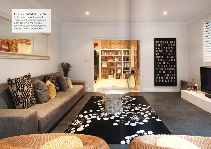 5. Tento obývací pokoj v mých oblíbených přírodních barvách. Navíc typografie jako umění na zdi a průhled do další místnosti, který potvrzuje pravidlo, že design jednotlivých místností musí na sebe navazovat.